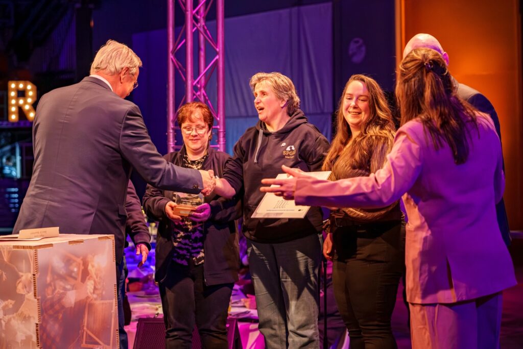 Dagbesteders Gerda en Marlies, vrijwilliger Sanne en bestuursleden Diana en Bernardo waren namens alle 100 vrijwilligers van SPGIJ aanwezig om de prijs in ontvangst te nemen. Gedurende de avond, met verschillende acts en waarbij ook heerlijk eten geserveerd werd bleek SPGIJ winnaar. Bestuurslid Bernardo Hulsman reageert tijdens de uitreiking: “Ik had er geen rekening mee gehouden [dat we zouden winnen], maar ik ben ontzettend blij. Echt een erkenning voor al onze vrijwilligers die hier wekelijks en soms meerdere dagen per week heel druk mee zijn. Die belangeloos voor mensen met een beperking klaarstaan, echt geweldig!”.